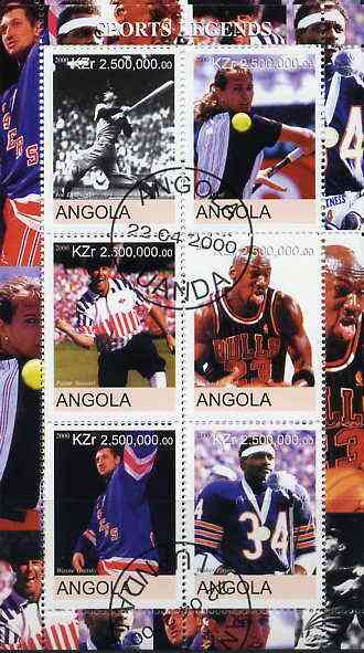 Angola 2000 Sports Legends perf sheetlet containing 6 values (Steffi Graf, M Jordan, Joe DiMaggio, W Paxton, W Gretsky & P Stewart) fine cto used