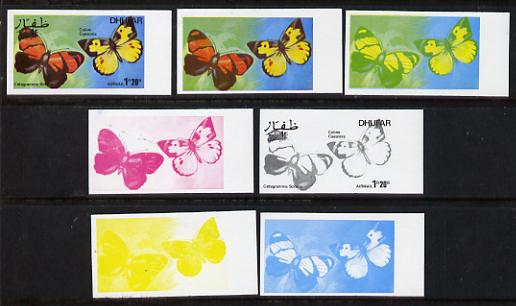 Dhufar 1977 Butterflies 1r20 (Catagramma S & Colias Caesonia) set of 7 imperf progressive colour proofs comprising the 4 individual colours plus 2, 3 and all 4-colour composites unmounted mint