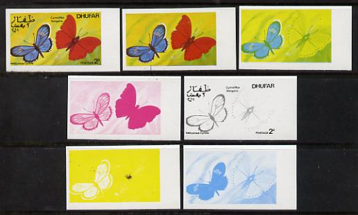 Dhufar 1977 Butterflies 2b (Heliconius Cyrbia & Cymothoe Sangaris) set of 7 imperf progressive colour proofs comprising the 4 individual colours plus 2, 3 and all 4-colour composites unmounted mint