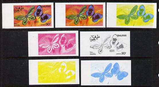 Dhufar 1977 Butterflies 30b (Pakio Alexandrae & Callithea Saphhira) set of 7 imperf progressive colour proofs comprising the 4 individual colours plus 2, 3 and all 4-colour composites unmounted mint