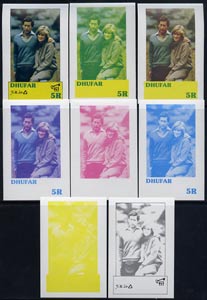 Dhufar 1982 Princess Di's 21st Birthday imperf deluxe sheet (5R value) the set of 8 imperf progressive colour proofs comprising the four individual colours plus various colour composites incl completed design (minor wrinkles) unmounted mint