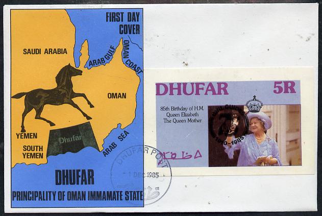 Dhufar 1985 Life & Times of HM Queen Mother imperf deluxe sheet (5R value) with Girl Guide 75th Anniversary opt in black, on cover with first day cancel