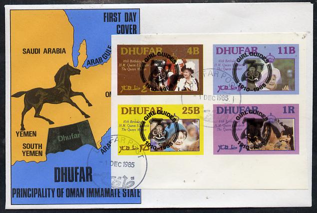 Dhufar 1985 Life & Times of HM Queen Mother imperf set of 4 with Girl Guide 75th Anniversary opt in black, on cover with first day cancel