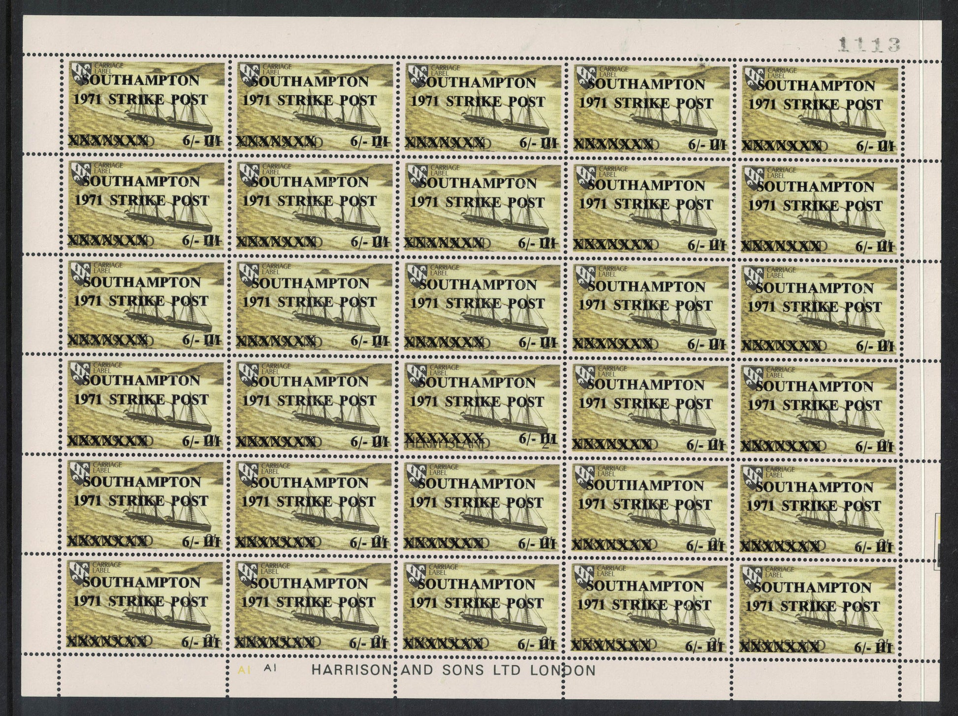GB 1971 Southampton Full Sheet of 6/- Olive Strike Mail on Herm Island Stamps U/M Printed by Harrison & Sons. Slight perf splitting at margins