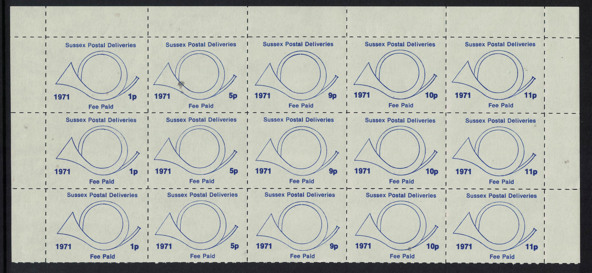 GB 1971 Sussex Strike Mail Part Sheet 1, 5, 9, 10 & 11p Se-tenant U/M
