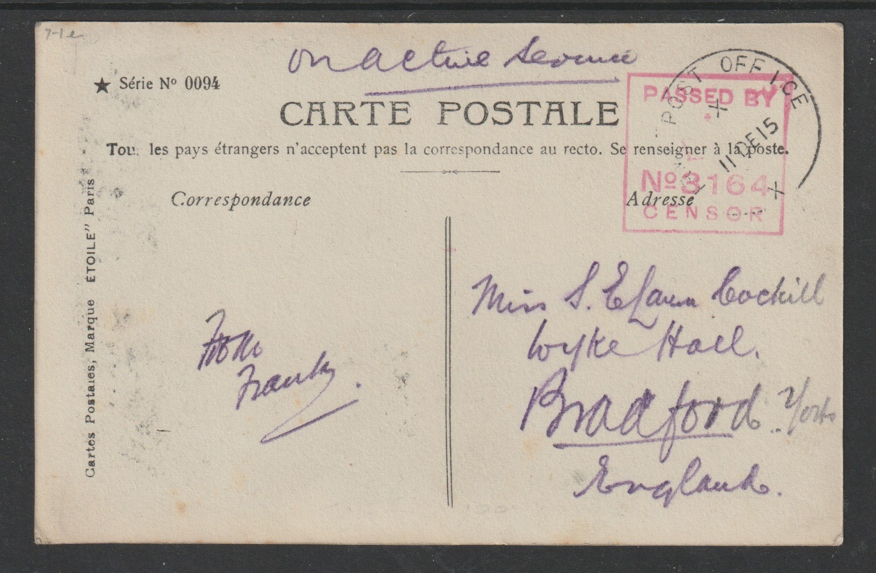 GB Great Britain 1915 KG5 OAS postcard FPO cancel addressed to Bradford with censor mark, fine