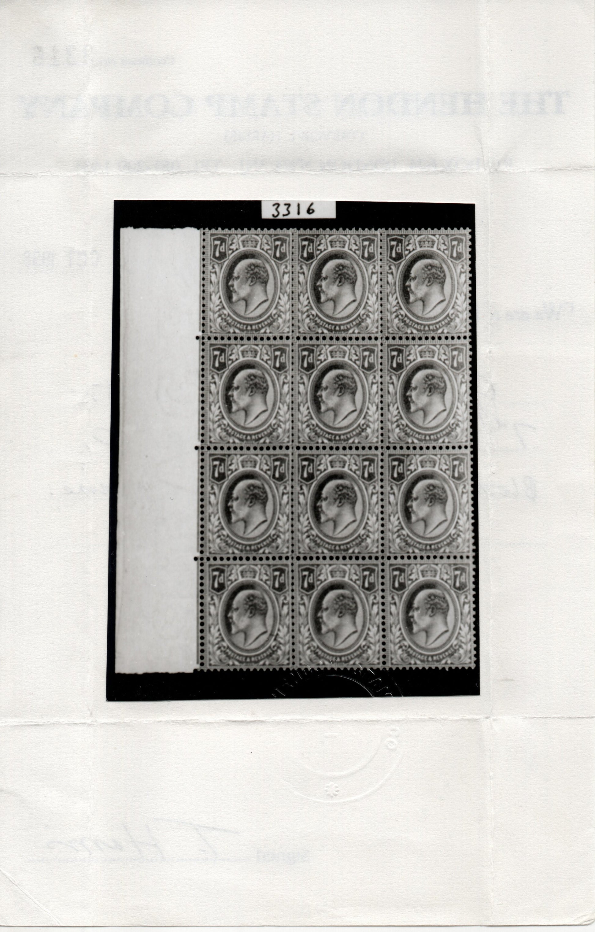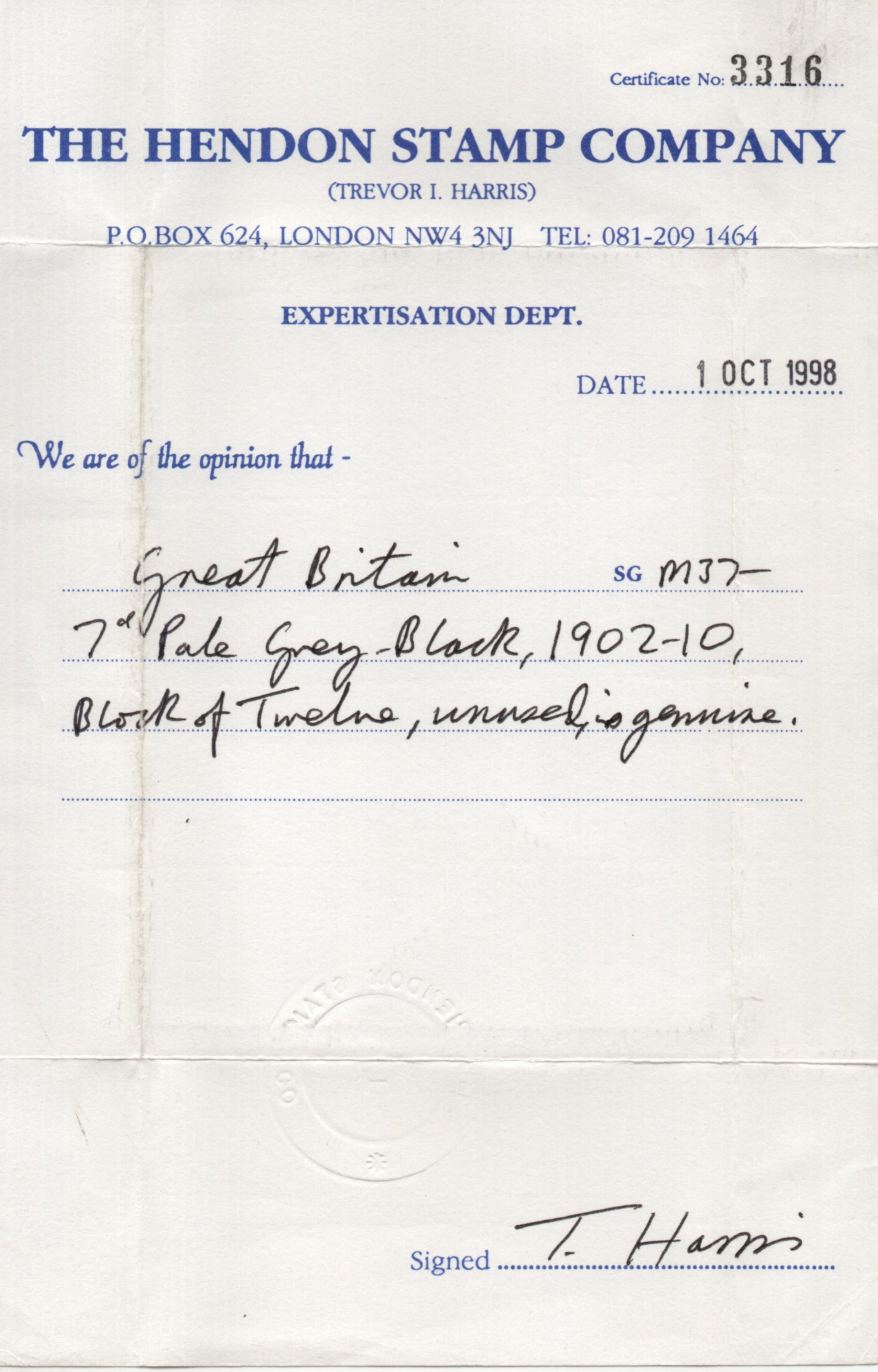GB KEVII 1902 SG Spec M37 7d Pale Grey-Black U/M Block of 12 with Hendon Cert