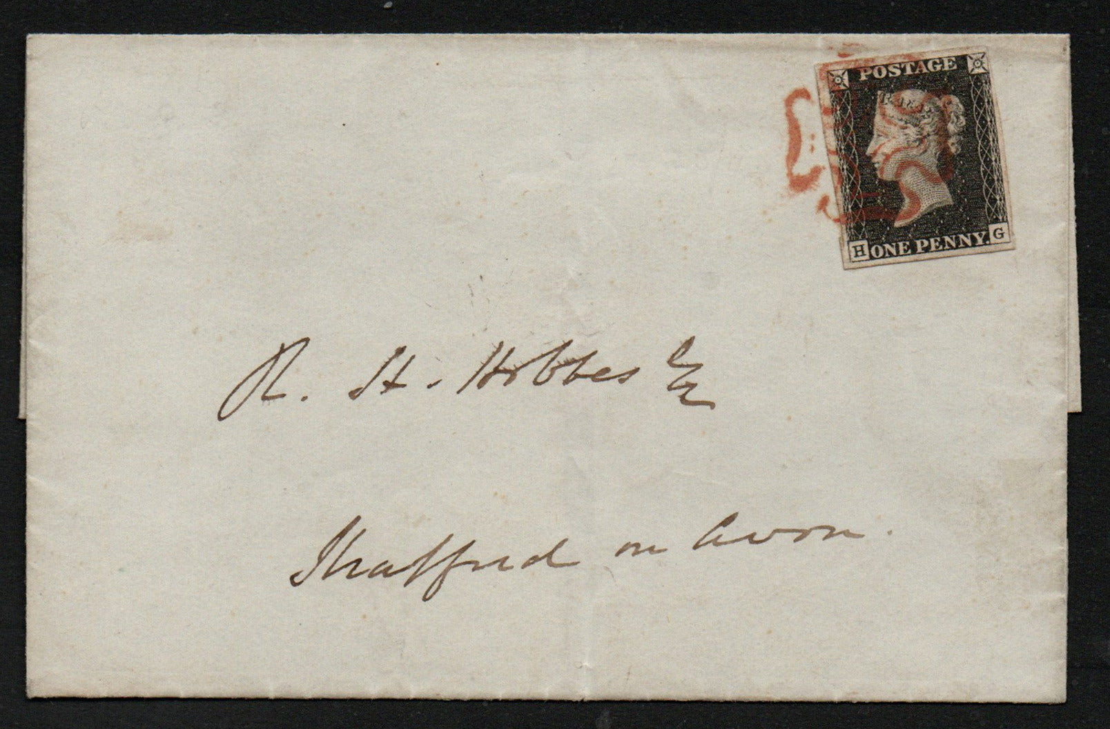 GB Line Engraved 25th May 1841 Wrapper (Empty) Addressed to Stratford on Avon bearing Penny Black SG3 Plate 2 AS15 H - G tied with Red M/C (LPS26)