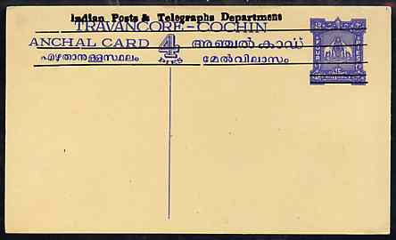 Indian States - Travancore-Cochin 1950c 4 pies p/stat card (Elephants) as H & G 4 but overprinted 'Indian Posts And Telegraphs Department' in black, original text obliterated with three horiz lines and stamp obliterated with five
