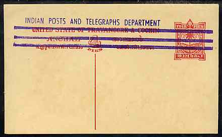 Indian States - Travancore-Cochin 1950c 4 pies p/stat card (Palm Tree) as H & G 3 but handstamped 'Indian Posts And Telegraphs Department' & original text and stamp obliterated