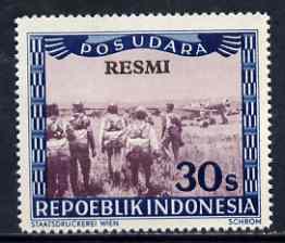 Indonesia 1948-49 perforated 30s produced by the Revolutionary Government in purple & blue showing air-crew approaching plane, opt'd 'RESMI' (prepared for Official use) without gum